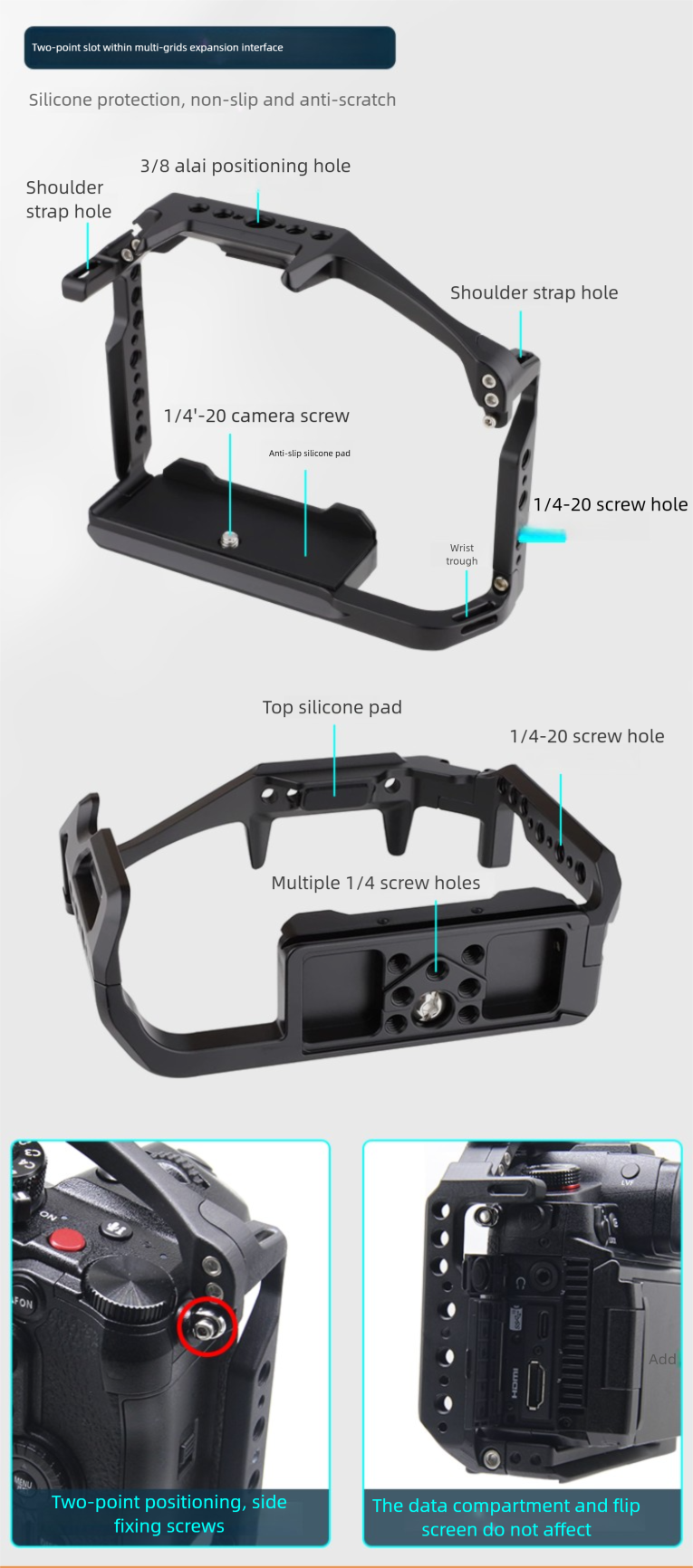 - Firm Installation & Full Access– The cage firmly lock the camera with a 1/4″ bottom screw and two anti twist pins. This formfitting cage ensures full access to the buttons, ports, LCD flip screen, and battery compartment. A nonslip rubber pad protects the camera from scratches