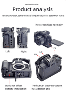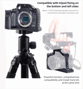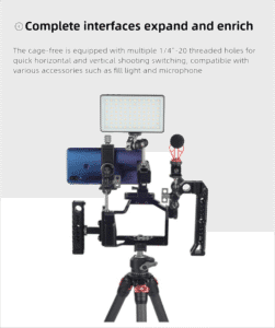 Mount mics, LED lights, monitors, or wireless transmitters via the top handle or cage frame, using multiple 1/4″-20 and 3/8″-16 threaded holes. Includes a magnetic tool for quick adjustments.✅ Tripod & Gimbal Friendly