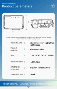 Engineered to precisely match Nikon’s full-frame Z5/Z6/Z7 and second-gen Z6II/Z7II cameras, ensuring a secure and stable mount without interfering with camera operation.All-Aluminum Build