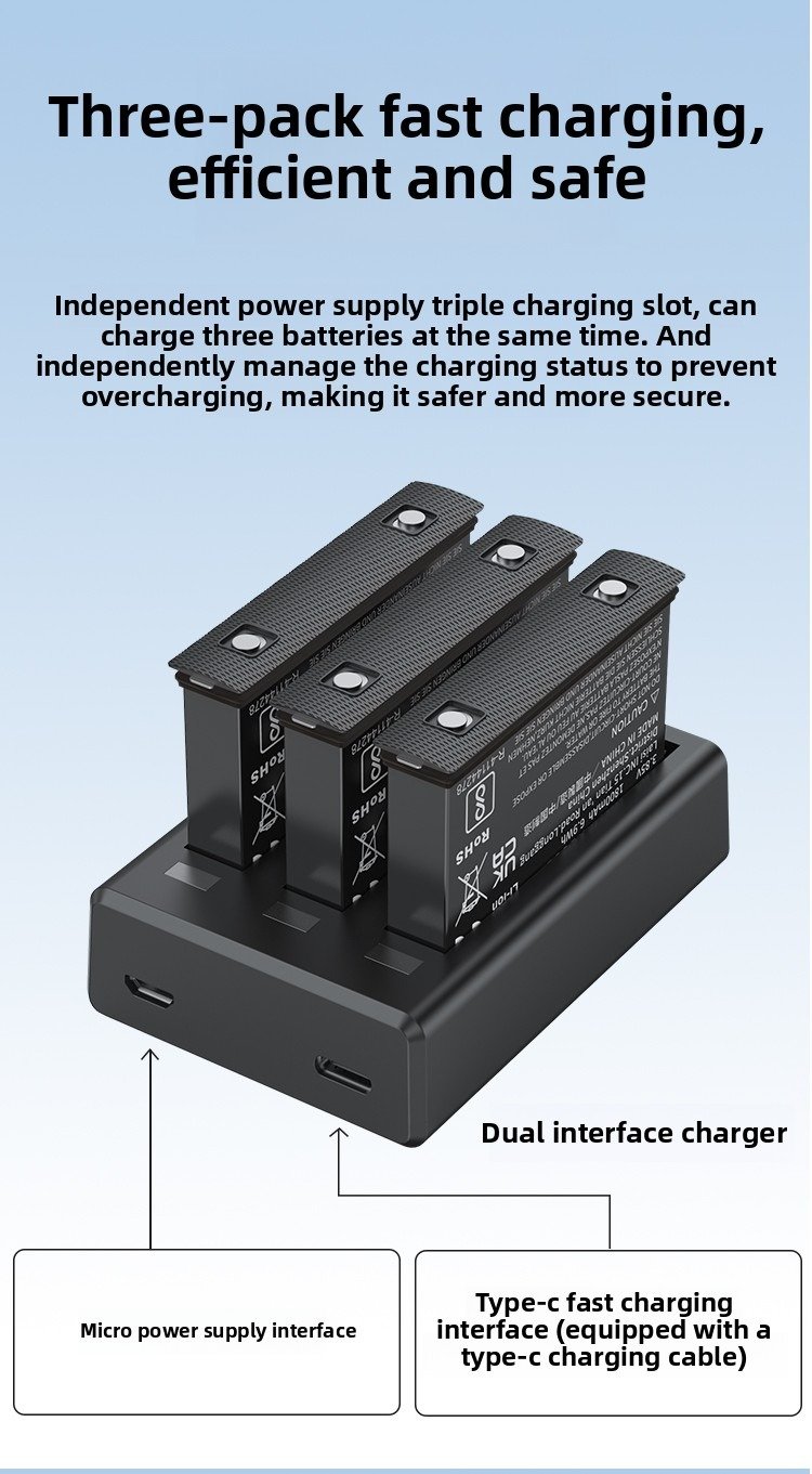 The Fast Charging Hub for the Insta360 X3 camera charges up to three X3 batteries simultaneously. Batteries charge in approximately 90 minutes, with an LED above each battery slot confirming whether the battery is charging, charged, or not charging because of malfunction. A USB-C charging port provides power to the hub, and overcharge protection ensures intelligent charging management.