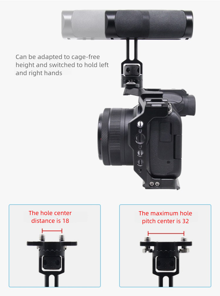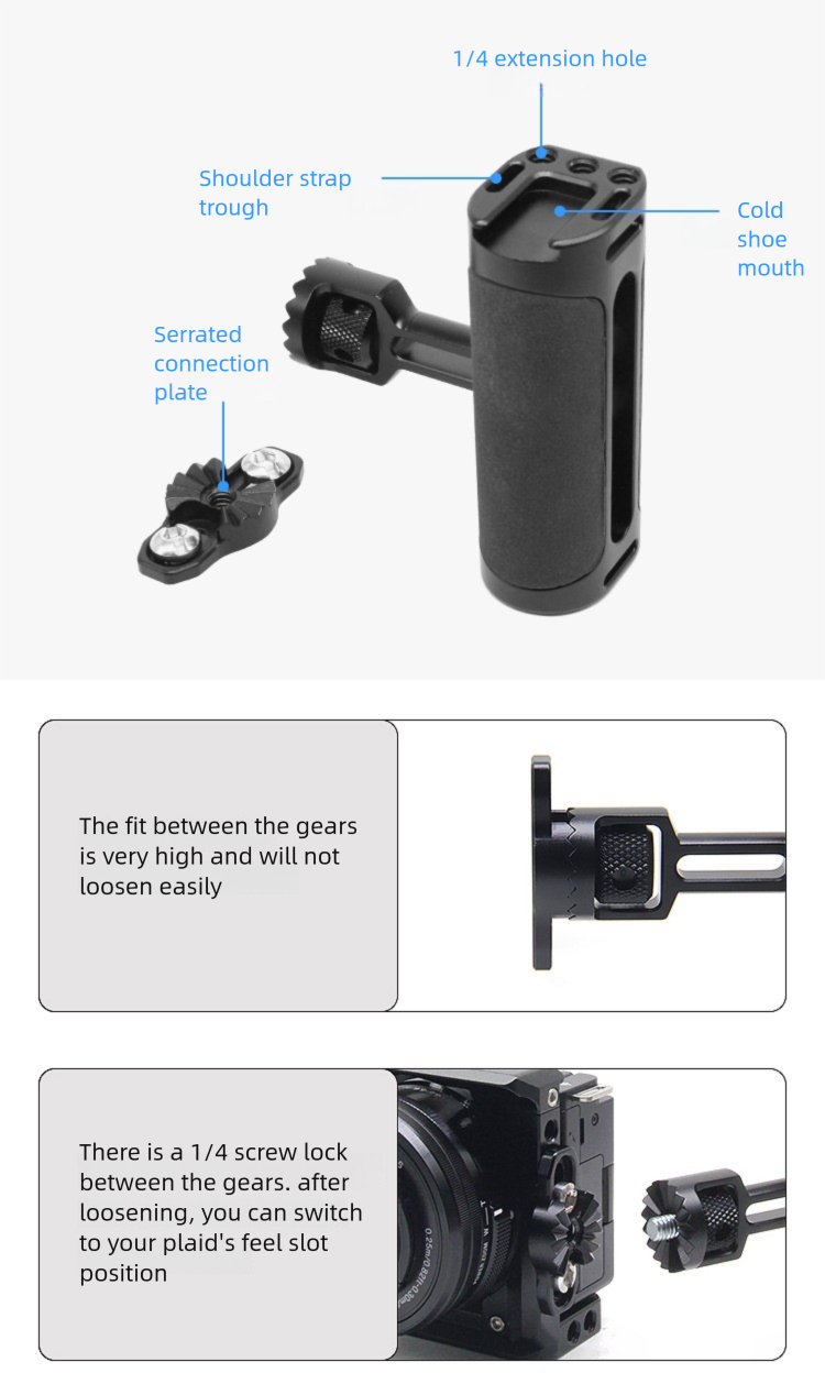 With a 1/4-inch screw lock mechanism, the handle can be quickly adjusted to match your preferred slot position or customized rig layout. You can easily switch the grip between the left and right hand, and its adaptable height allows it to work seamlessly with cage and cage-free setups.