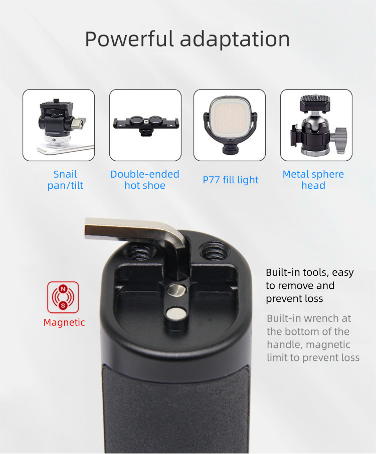 For added convenience, the handle includes a built-in magnetic wrench at the base, making adjustments fast and tool-free while preventing loss. Crafted from durable, anti-slip silicone and aluminum alloy, this grip is both strong and comfortable, allowing for long shooting sessions without hand fatigue.